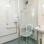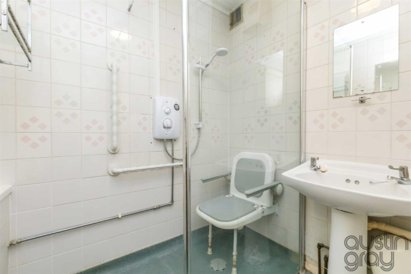 Wet room, electric shower and screen pedestal wash basin and radiator.