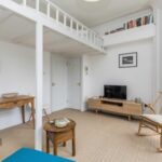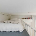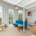 To the front of the flat is the studio room with three full height sash windows one of which allows access out to the south facing balustraded balcony, fitted blackout blinds, radiator, cupboard housing combination boiler and separate shelves and hanging rail cupboard. Wooden stairs steps rise to a mezzanine level used as a sleeping area with five deep storage cupboards that extend over the kitchen and wet room.