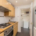 Telephone entry phone allows access through a well-maintained communal hallway with stairs rising to the first floor landing. The front door opens into an entrance vestibule with a meters cupboard and there is plumbing and space for a washing machine and fitted shelving.