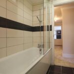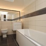 Newly fitted contemporary white suite comprising of enamelled bath with mixer taps, shower attachment and glass screen, wall hung wash basin with storage beneath, WC with enclosed cistern, tiled walls and floor, towel radiator, fitted mirror with LED lighting, extractor fan.