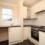 Newly fitted kitchen with stainless steel sink and drainer, work surfaces with cupboard and drawer storage above and below, four ring ceramic hob with electric oven beneath and extractor fan above, wall mounted combination boiler, additional standing space for appliances, sash window to the side, bevelled tiled walls, tiled floor.
