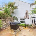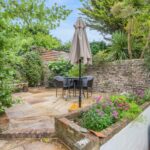 Walled front garden and the rear garden has sandstone paving and steps rising up to a pretty, walled garden with raised flower and shrub borders.