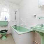 Bathroom/WC, enamel bath, low-level WC and pedestal wash hand basin, heated towel radiator, window to the rear.