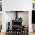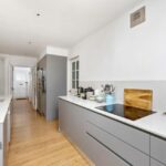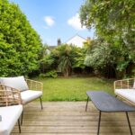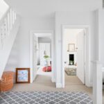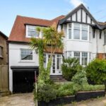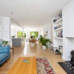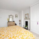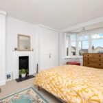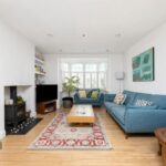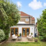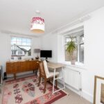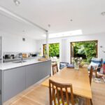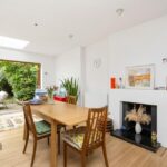 Ascending the stairs to the enclosed porch and upon entering through the front door, directly to your left are stairs rising to the first and second floor, whilst ahead glass paned doors open into a spacious kitchen with integrated appliances, dining room and living room.This open plan space is flooded with natural light, enhanced by a skylight lantern in the kitchen and a large bay window with plantation shutters in the living room. The interiors are sleek and bright, featuring light wood flooring throughout and a wood burner fireplace. Two sets of double doors lead out of the kitchen and into a west facing rear garden lined with mature shrubbery. Just off the kitchen, you will find a separate utility room and W/C with further access to the garden.