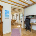 A dining room overlooks the front garden with a small snug to one side with a small window. Door to study area with fitted shelving and storage to one side leading through to