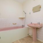 Bathroom / WC. Enclosed bath, pedestal wash basin and low-level WC.
