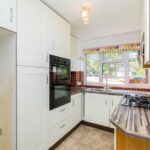 Kitchen Range of working services provided storage both above and below, with integrated appliances including a four ring gas hob with extractor fan above, double oven and standing space for fridge/freezer. A stainless-steel sink is in front of the double-glazed window with its Southerly aspect.