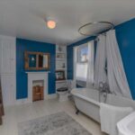 Painted original floorboards, freestanding claw foot bath with separate shower over. Pedestal wash hand basin, low level WC. Original decorative fireplace, cupboards and shelving. Vintage light fitting. Access to rear roof space. Fitted cupboard housing newly-installed combination boiler (covered by a seven-year guarantee).