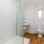 Shower/WC has a white suite with a walk-in shower cubicle with fitted shower, wash hand basin, low-level WC, partially bevelled tiled walls, double glazed window to the side and towel radiator.