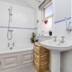 White suite comprising of enclosed bath, pedestal wash basin, low-level WC, radiator, window to the side.