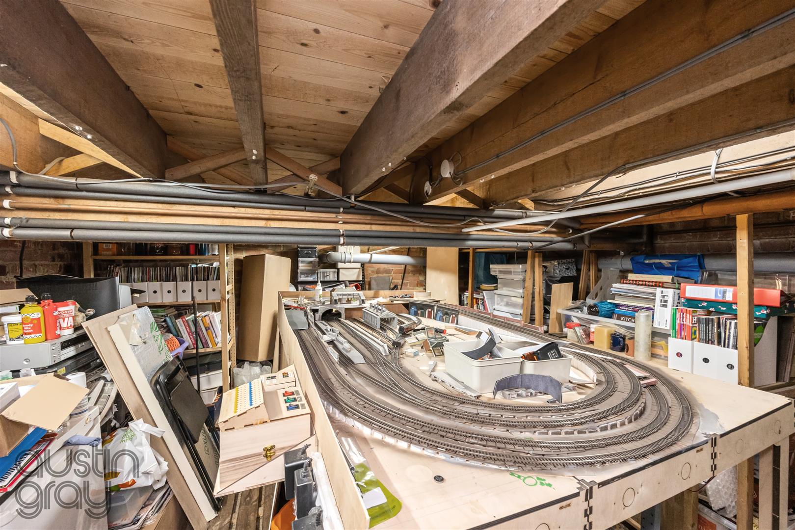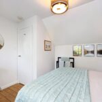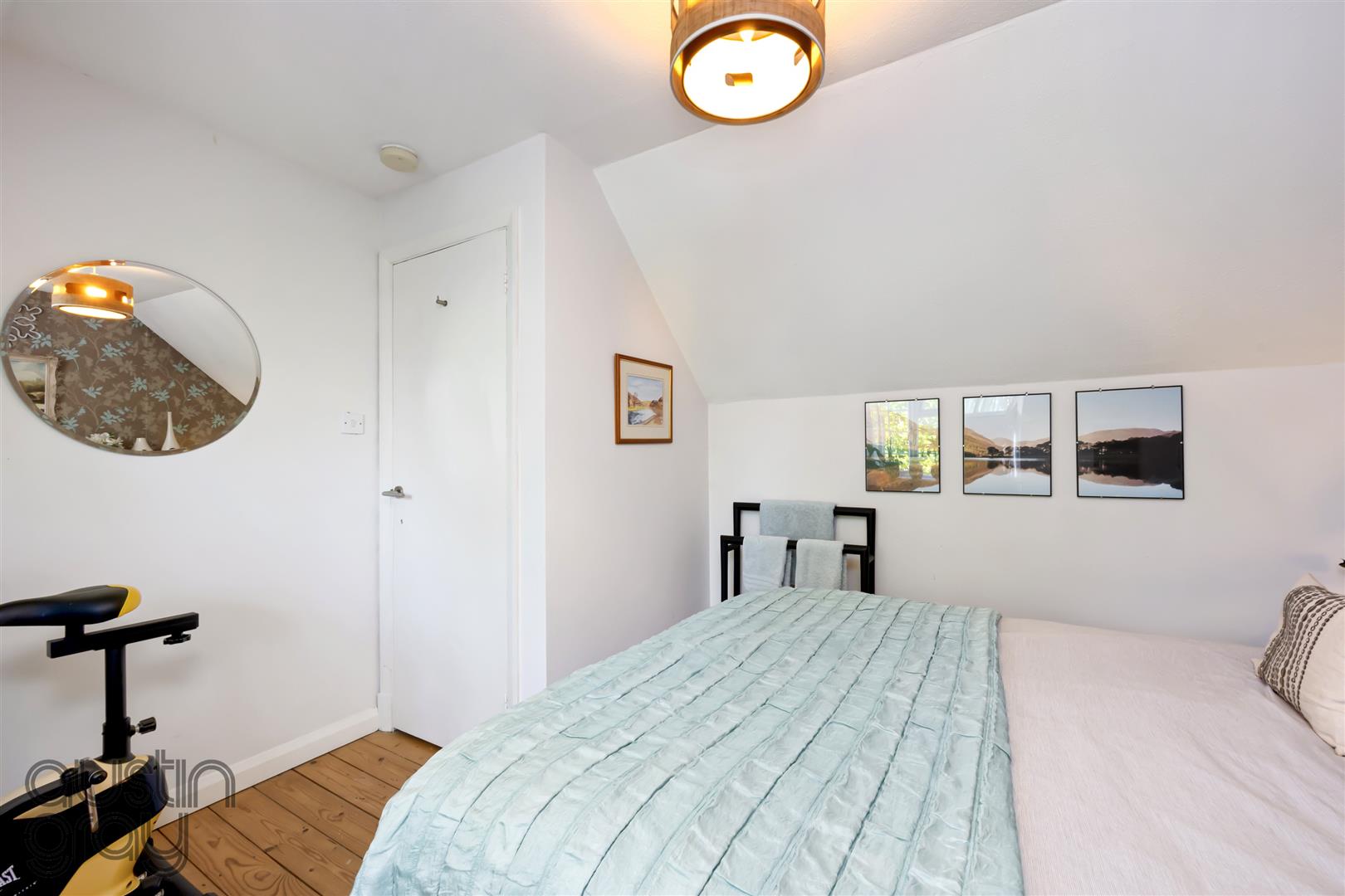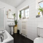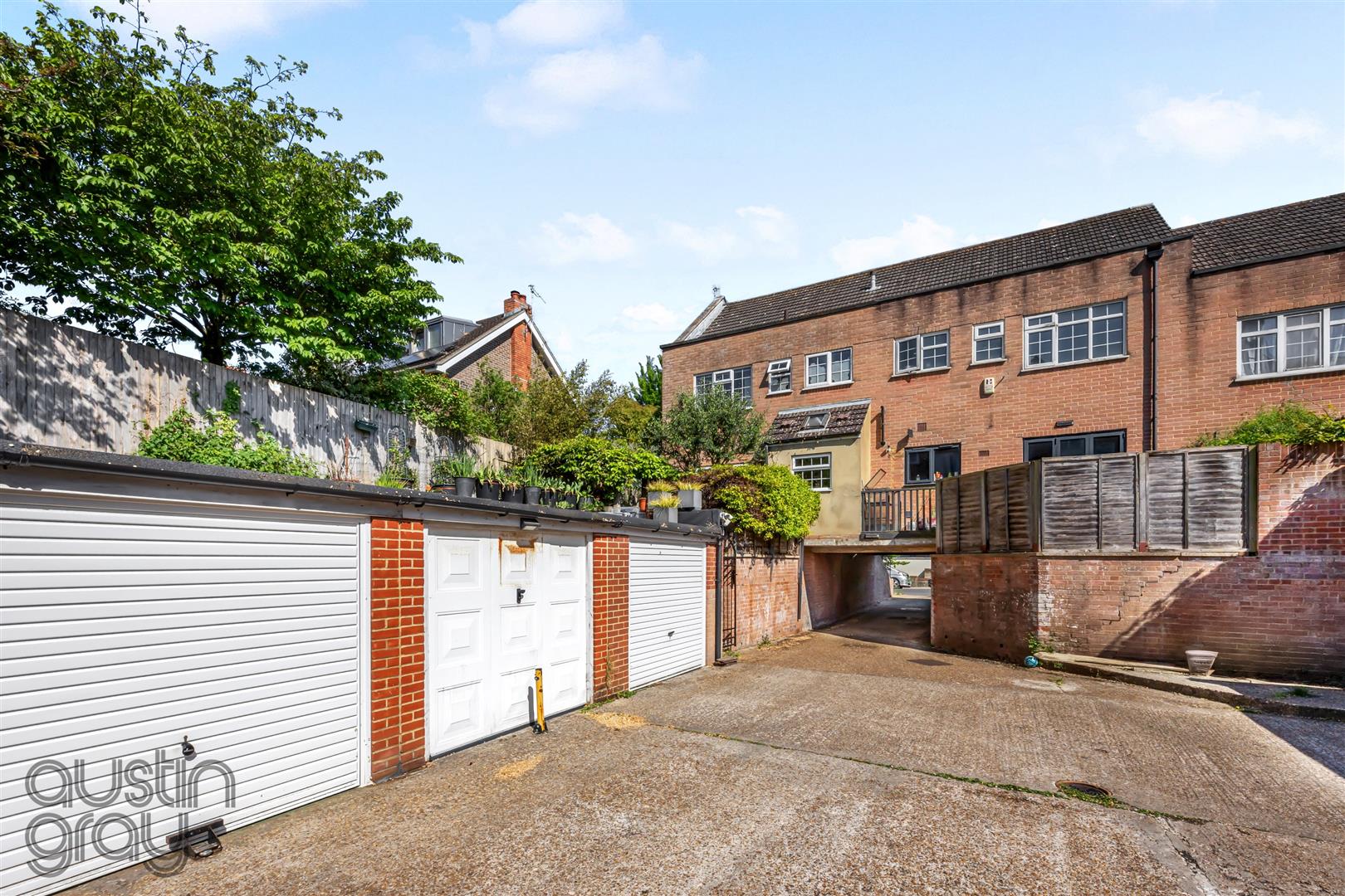 The first floor offers a crisp white family bathroom and two generous double bedrooms, with the principal arranged in an L-shape to create a separate dressing area. The top floor houses a further double bedroom with wood flooring and eaves storage. Additional highlights include a discreetly accessed cellar, versatile for storage or creative use, and off-street parking via a garage, accessible from the rear garden or street.